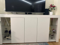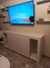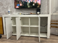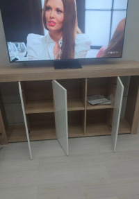 Модель оснащена тремя распашными дверцами. За каждой дверцей находятся два вместительных отделения с полками, что обеспечивает удобное хранение одежды, белья, посуды, документов и других вещей. По бокам комода предусмотрены открытые секции со стеклянными полками для декора или полезных мелочей.