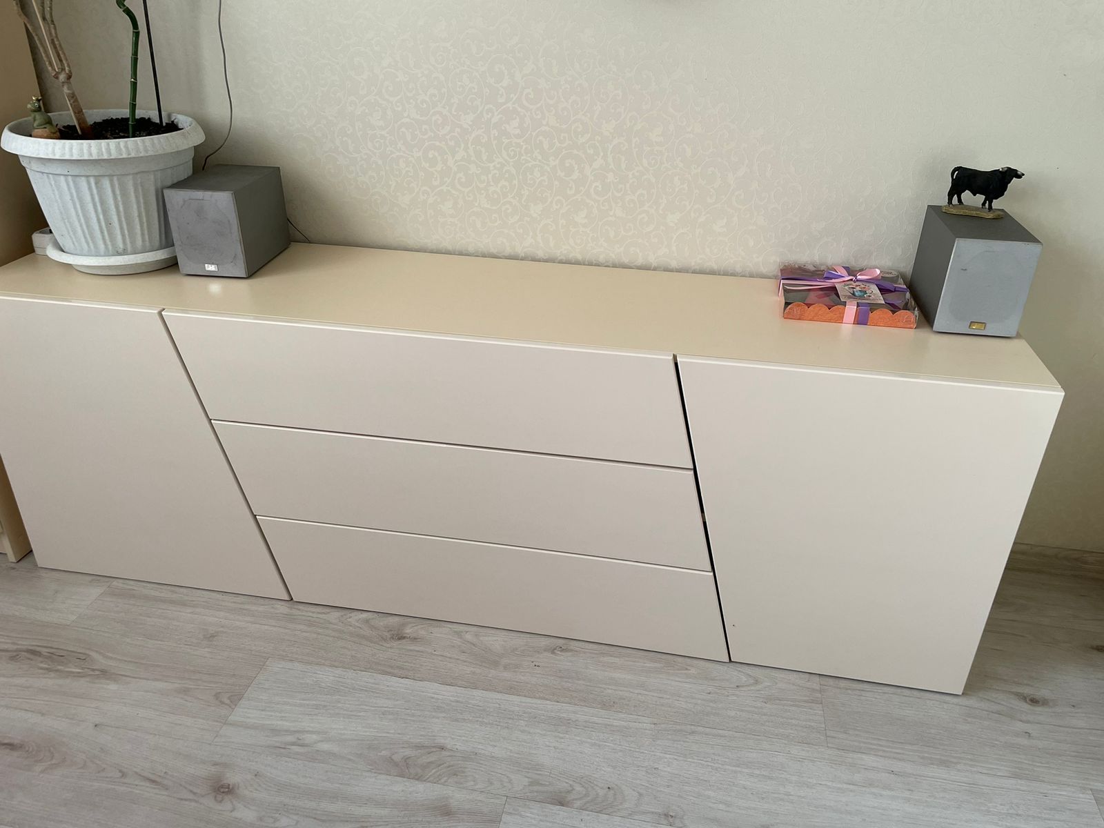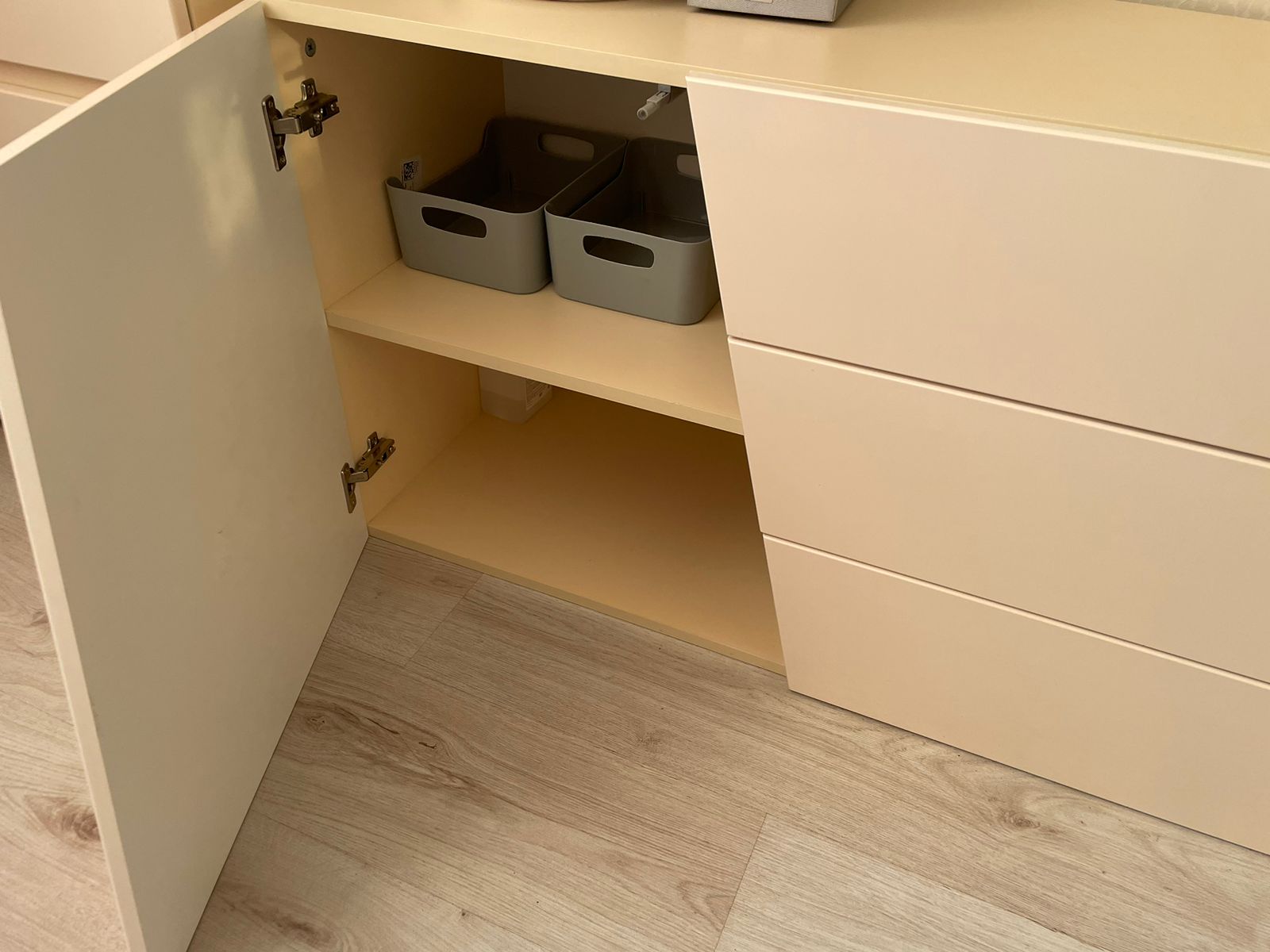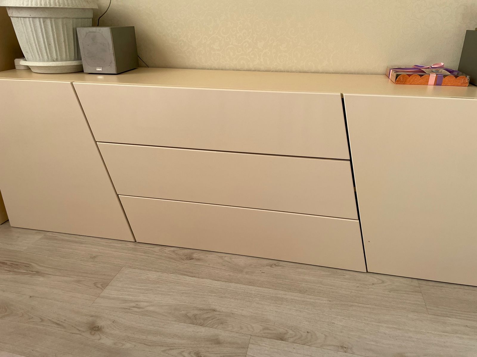 Конструкция продумана для повседневного комфорта: по краям расположены две распашные дверцы, а в центральной части - три вместительных выдвижных ящика. Такое сочетание позволяет удобно разместить одежду, белье, документы, аксессуары и другие необходимые вещи. Система открывания нажатием подчеркивает лаконичный внешний вид модели и делает использование еще более удобным.