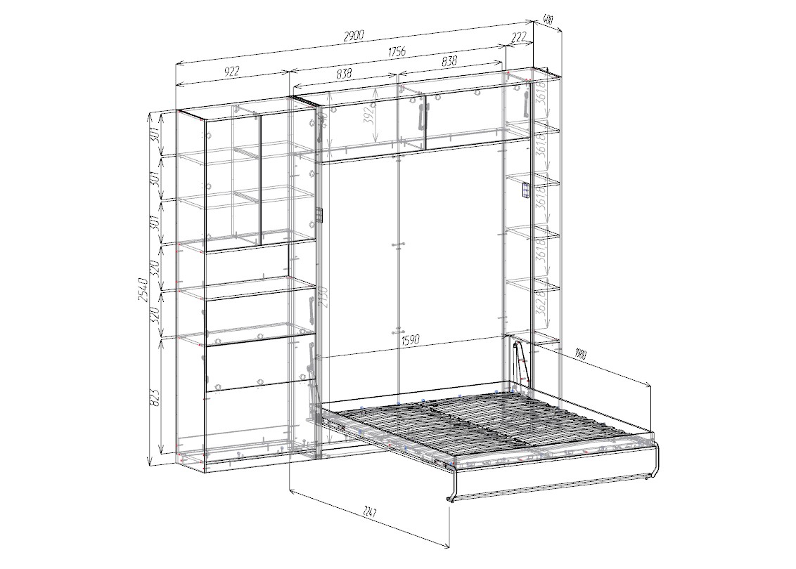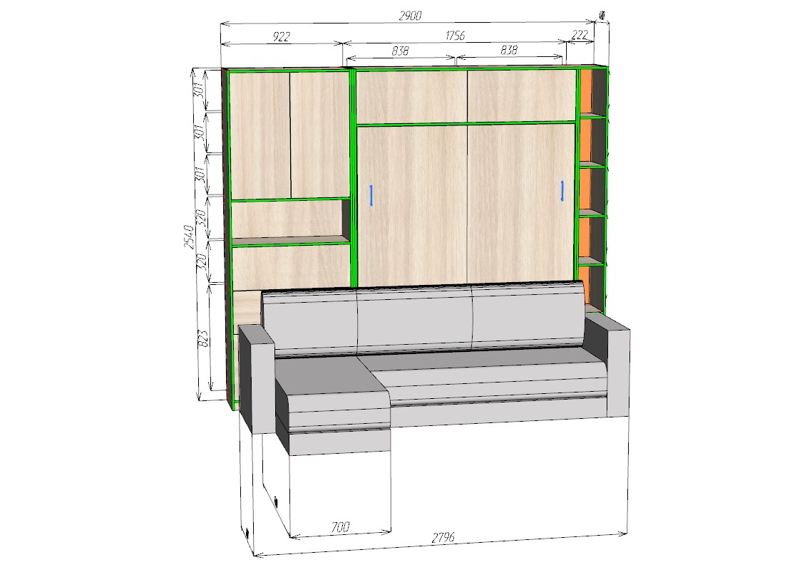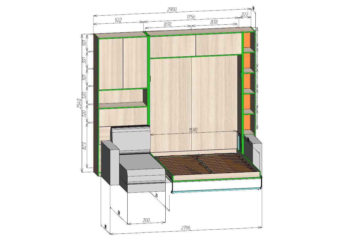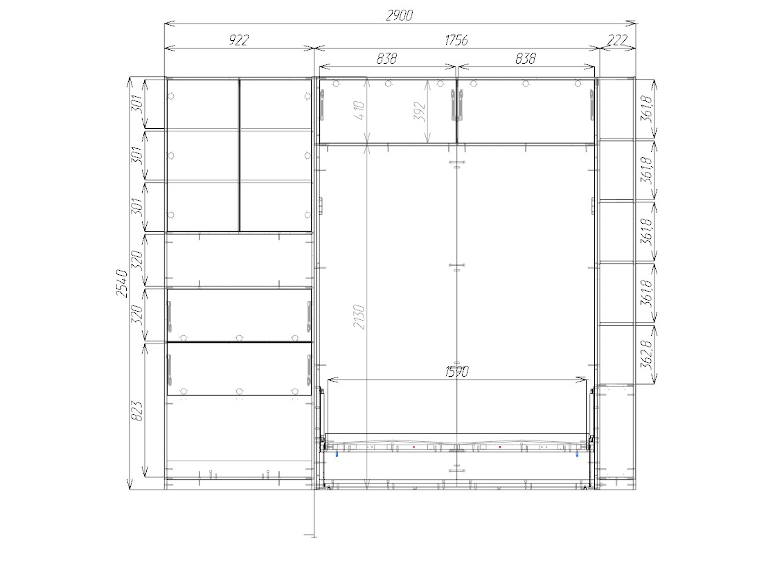 ?️ За декоративными дверцами расположен откидной модуль с двуспальной кроватью — оптимальное решение для экономии пространства.