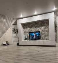 Стенка включает верхние и нижние модули с откидными дверцами, а также боковые вертикальные секции с распашными фасадами и внутренними полками. Такое решение позволяет удобно разместить технику, документы, книги, аксессуары и другие необходимые вещи, сохраняя порядок и чистоту линий. Закрытые отделения скрывают содержимое от глаз, а широкая открытая центральная зона отлично подходит для размещения телевизора и декоративных элементов.