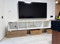 Лучшее что может быть. Идеально подошла под потребности. Повесил без использования задней стенки чтоб плотно прилегала к стене. Одна деталь не сошлась и в моменте появилось желание обменять ее. Но лень работать с возвратом и магия «мягких опилок» в дсп позволили собрать даже с такими косяками. Но если хочется длинную подвесную тумбу то у этого варианта нет конкурентов. Размеры тумбы позволили уместить PlayStation 5 slim стоя (сверху 1см). Так же Яндекс станция Макс и ресивер. Все уместилось. Снизу подсветку добавил от Яндекса.