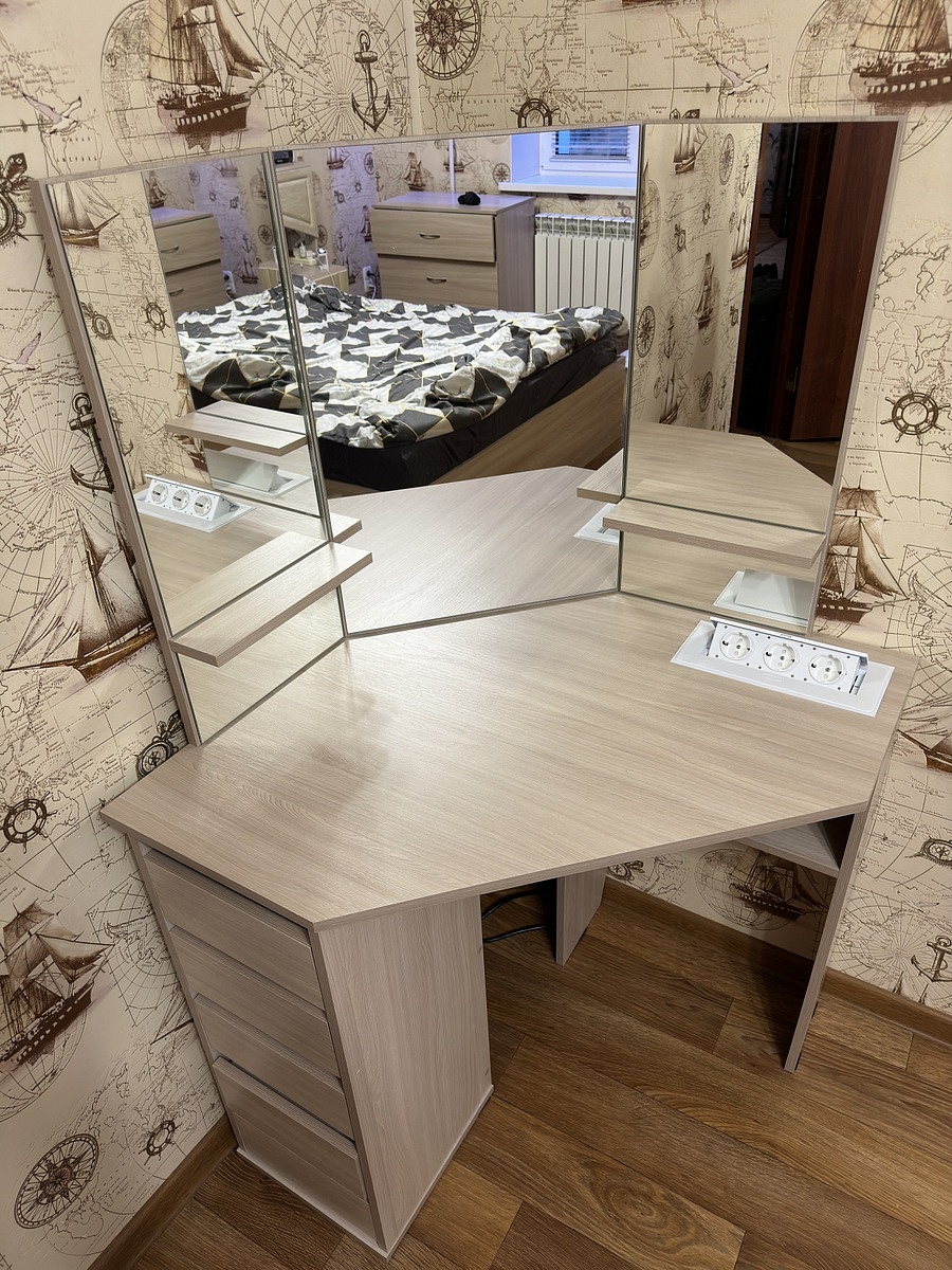 Забудьте о тесных и неудобных туалетных столиках! Представляем вам "Элеганса" – угловой шедевр, созданный для того, чтобы стать центром вашей личной косметической вселенной. Этот столик – не просто мебель, а настоящее произведение искусства, которое идеально впишется в любой интерьер, будь то классическая спальня или современная студия.